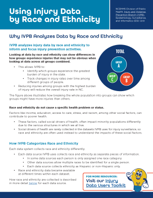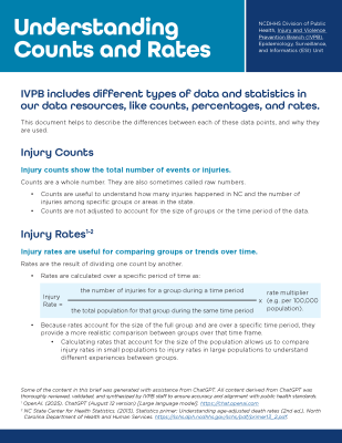 The NC Injury Data User Toolkit helps injury data users navigate and understand the data resources the NCDHHS Injury and Violence Prevention Branch (IVPB) creates. The branch's Epidemiology, Surveillance and Informatics (ESI) Unit provides the resources.